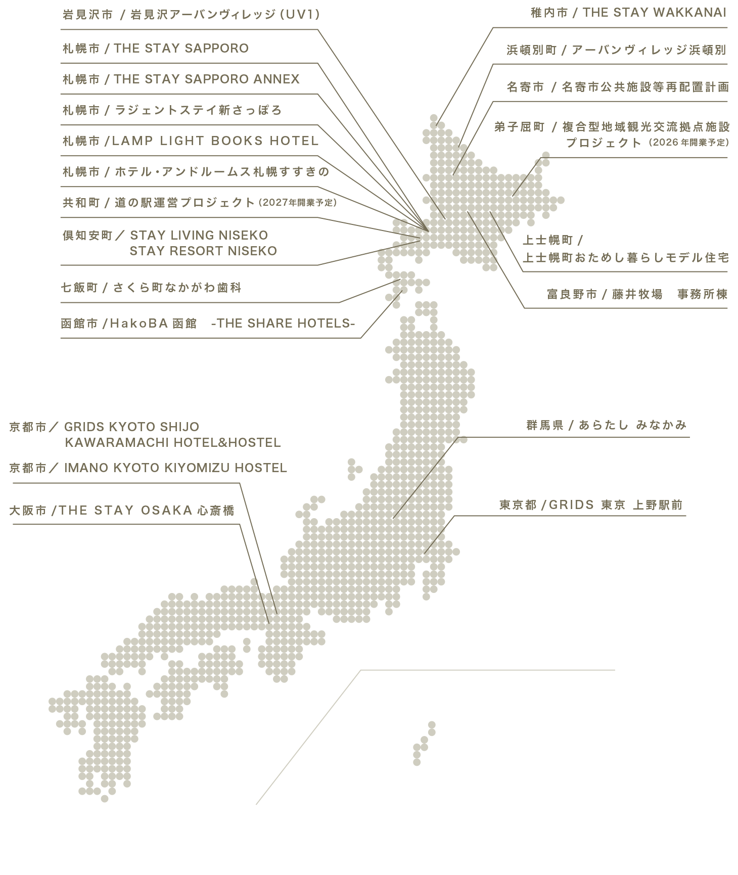 2015年。インバウンドが加速度的に増えていた北海道に、自社で企画・運営まで手掛ける国内最大級(160人収容)のゲストハウスをオープンしました。発想のポイントは「ゲストハウスが160人のまちだったら?」。宿泊施設という枠組みの中から、国を超えた相互理解を醸成し、コミュニティを世界にまで広げたいという私たちの「ありたい未来」の実現に向けたプロジェクトです。宿泊サービスの企画・運営メソッドは、ここから生まれました。